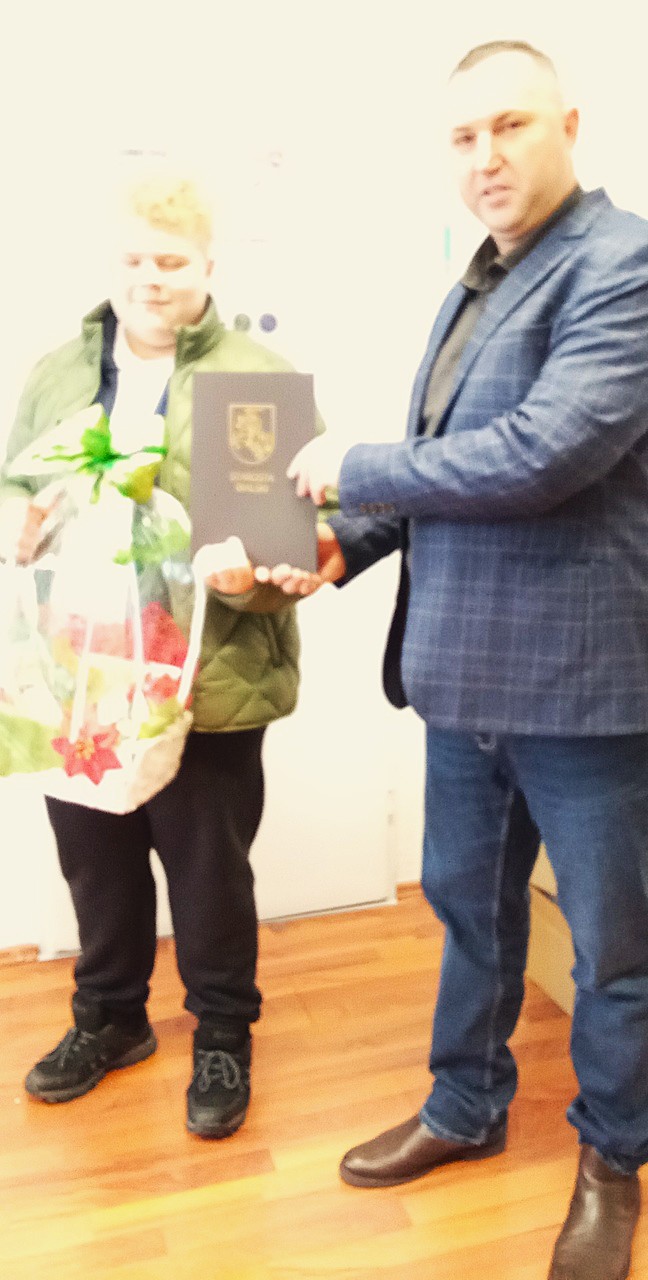 Miło nam poinformować, że uczeń klasy VII – Szymon Wawryniuk – za swoje zaangażowanie w zbiórkę surowców wtórnych otrzymał dyplom oraz nagrodę w postaci kosza słodyczy, natomiast szkoła otrzymała bon o wartości 300 zł. Nagrodę odebrał osobiście w siedzibie Starostwa Powiatowego wraz z dyrektorem szkoły, panem Andrzejem Haponiukiem.