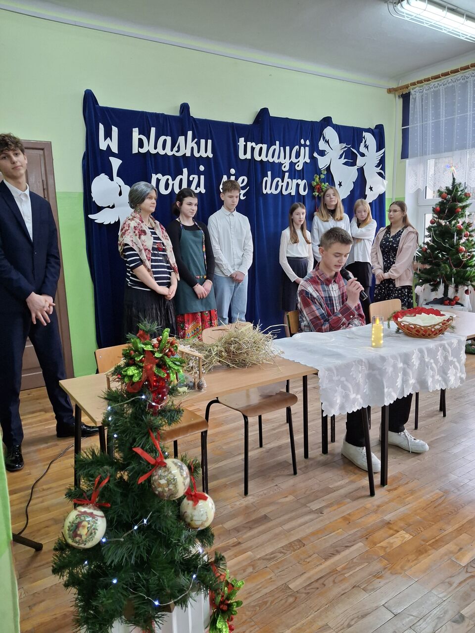 Celem spotkania było dokładniejsze poznanie tradycji i zwyczajów wieczoru wigilijnego i złożenie sobie wzajemnych życzeń. Wyjątkowo efektownie zabrzmiały kolędy zaśpiewane przez uczniów do których, zagrał p. Andrzej Maziejuk. Przybliżyły one atmosferę rodzinnych świąt. Słowa Ewangelii o narodzeniu Chrystusa uroczyście odczytał ks. Proboszcz Daniel Sałasiński. Przypomniał, że Bóg przyszedł na ziemię w osobie Jezusa. A tradycje związane ze świętami są przekazywane z pokolenia na pokolenie. O wielu zapomniano, ale niektóre przetrwały do dnia dzisiejszego i są pielęgnowane. Na zakończenie wszystkim zgromadzonym p. Dyrektor Andrzej Haponiuk złożył życzenia świąt radosnych i bezpiecznych.